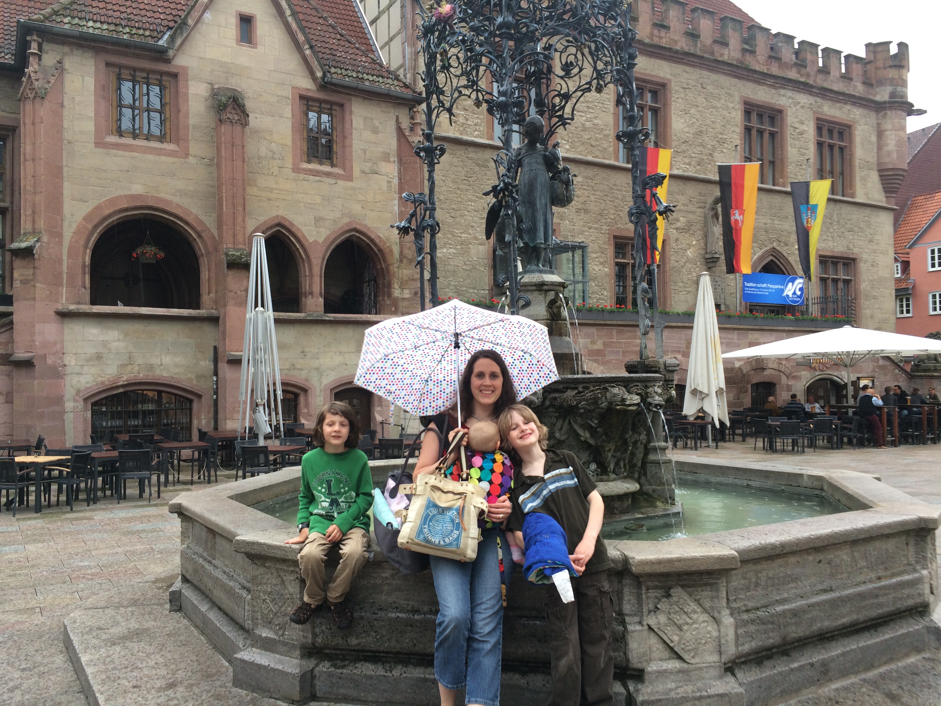 So this past week we celebrated our one year anniversary of moving here to Germany. We had eaten at a restaurant called Nudelhaus our first night here, so we returned there this week. I also made sure to take a picture of the family in front of the Gänseliesel, a fountain at the center of the downtown area.